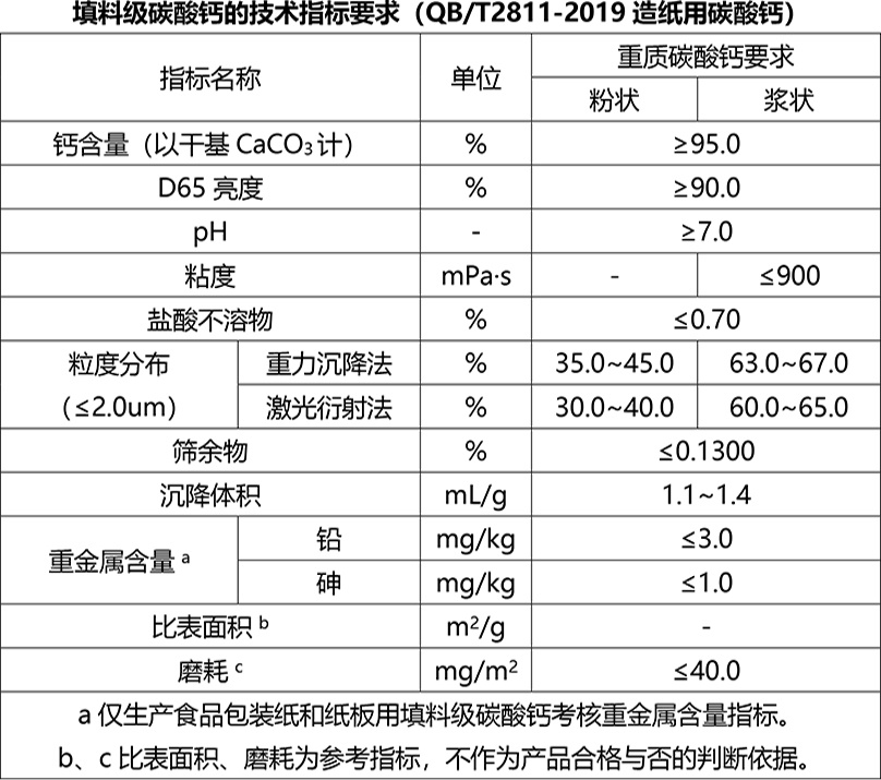 2020年4月1日,QB/T2811-2019造紙用碳酸鈣代替QB/T2811-2006造紙研磨碳酸鈣正式實施。依據(jù)標(biāo)準(zhǔn),造紙用碳酸鈣按產(chǎn)品用途分為填料級碳酸鈣、涂布級碳酸鈣。其中填料級碳酸鈣包括重質(zhì)碳酸鈣(研磨碳酸鈣)和輕質(zhì)碳酸鈣(沉淀碳酸鈣),涂布級碳酸鈣包括底涂碳酸鈣和面涂碳酸鈣。